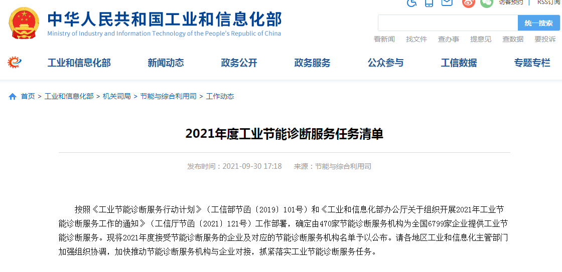 根據(jù)2021年9月30日,國(guó)家工業(yè)和信息化部《工業(yè)節(jié)能診斷服務(wù)行動(dòng)計(jì)劃》(工信部節(jié)函〔2019〕101號(hào))和《工業(yè)和信息化部辦公廳關(guān)于組織開展2021年工業(yè)節(jié)能診斷服務(wù)工作的通知》(工信廳節(jié)函﹝2021﹞121號(hào))工作部署。