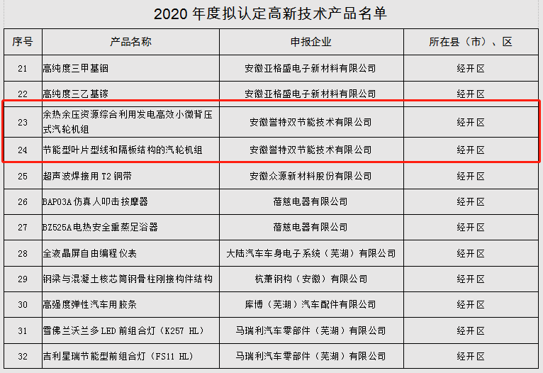 2021年1月11日,安徽省高新技術產(chǎn)品認定名單正式公布。我公司產(chǎn)品“余熱余壓資源綜合利用發(fā)電高效小微背壓式汽輪機組、節(jié)能型葉片型線和隔板結構的汽輪機組”兩項產(chǎn)品喜獲認定,這次獲得高新技術產(chǎn)品認定再一次驗證了安徽譽特雙的卓越品質,同時也是對我司產(chǎn)品權威的肯定!