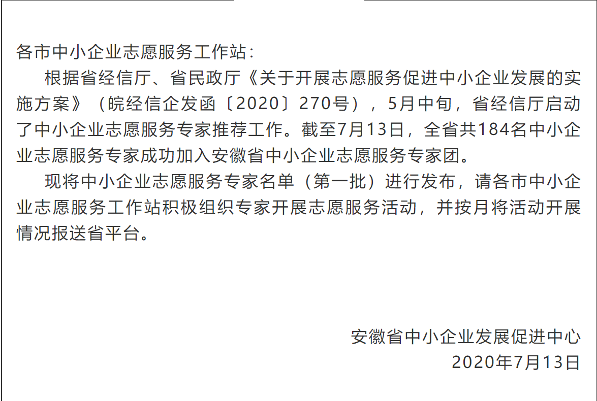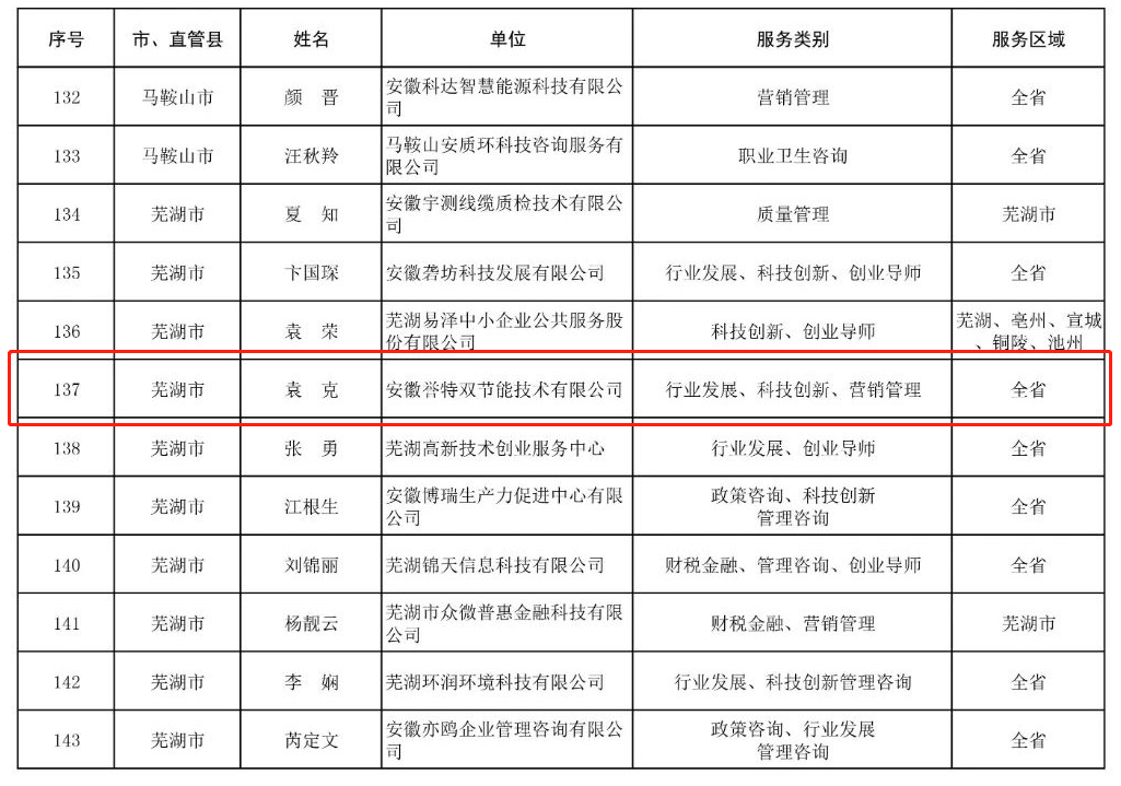 7月13日,安徽省中小企業(yè)志愿服務(wù)專家名單第一批,經(jīng)省經(jīng)信廳、省民政廳審核、認定,并正式予以公布。我公司總經(jīng)理袁克同志榮登榜單,喜獲認定,同時也是蕪湖市唯一的節(jié)能環(huán)保產(chǎn)業(yè)入選單位。