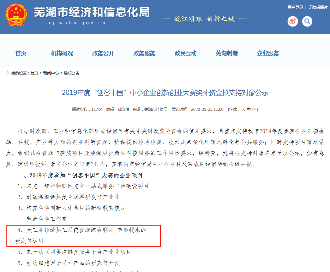 其中我公司創(chuàng)新創(chuàng)業(yè)項目——大工業(yè)領(lǐng)域熱工系統(tǒng)資源綜合利用節(jié)能技術(shù)的研發(fā)與運(yùn)用,獲得蕪湖市第四名,并取得獎補(bǔ)資金支持,在此表示熱烈祝賀。下一步,公司仍將整合資源,奮發(fā)作為,再上新臺階,為國家節(jié)能環(huán)保事業(yè)貢獻(xiàn)力量!