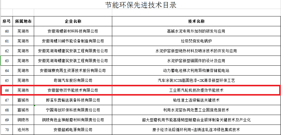 12月2日,安徽省經(jīng)濟(jì)和信息化廳發(fā)布了2019年全省工業(yè)領(lǐng)域節(jié)能環(huán)保產(chǎn)業(yè)“五個一百”推介目錄公告,安徽譽(yù)特雙節(jié)能技術(shù)有限公司入選《節(jié)能環(huán)保服務(wù)機(jī)構(gòu)目錄(2019)》,也是蕪湖市唯一的入選單位,同時公司節(jié)能技術(shù)“工業(yè)蒸汽輪機(jī)技改提效節(jié)能技術(shù)”入選《節(jié)能環(huán)保先進(jìn)技術(shù)目錄(2019)》。