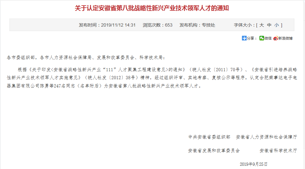 2019年11月12日,經(jīng)中共安徽省委組織部、安徽省人力資源和社會保障廳、安徽省發(fā)展和改革委員會、安徽省科學(xué)技術(shù)廳四部門聯(lián)合發(fā)文“經(jīng)過組織評審、實(shí)地考察、復(fù)核公示等程序,認(rèn)定安徽省第八批戰(zhàn)略性新興產(chǎn)業(yè)技術(shù)領(lǐng)軍人才名單,正式予以公布?!?/span>