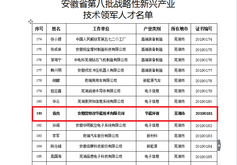 我安徽譽(yù)特雙節(jié)能技術(shù)有限公司總經(jīng)理袁克同志榮登榜單,喜獲認(rèn)定,同時(shí)也是蕪湖市唯一的節(jié)能環(huán)保產(chǎn)業(yè)入選單位。該次認(rèn)定工作,注重向人工智能、高檔數(shù)控機(jī)床和機(jī)器人、先進(jìn)軌道交通裝備、節(jié)能與新能源汽車、新材料、生物醫(yī)藥、現(xiàn)代農(nóng)業(yè)機(jī)械裝備、現(xiàn)代物流等制造業(yè)重點(diǎn)領(lǐng)域和戰(zhàn)略性新興產(chǎn)業(yè)傾斜。