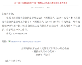 2018年7月24日,國(guó)家科技部全國(guó)高新技術(shù)企業(yè)認(rèn)定管理工作領(lǐng)導(dǎo)小組辦公室,通過(guò)科技部火炬中心官網(wǎng)發(fā)布——安徽省2018年第一批國(guó)家級(jí)高新技術(shù)企業(yè)認(rèn)定名單的公示通知,我公司安徽譽(yù)特雙節(jié)能技術(shù)有限公司榜上有名,目前已順利通過(guò)公示,正式予以認(rèn)定,公司在此表示熱烈祝賀!
