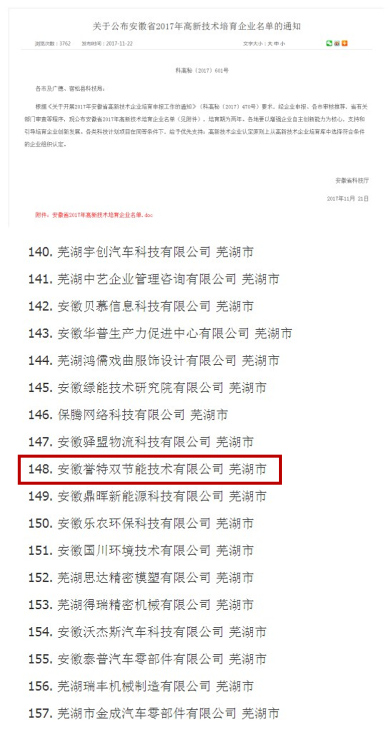 安徽省科技廳于2017年11月23日,發(fā)布本年度安徽省高新技術(shù)培育企業(yè)名單,我公司安徽譽(yù)特雙節(jié)能技術(shù)有限公司通過審核,排續(xù)148號(hào)。公司全體同仁須齊心協(xié)力、勵(lì)精圖治,順利通過2018年的專項(xiàng)評(píng)審工作,獲得授牌!