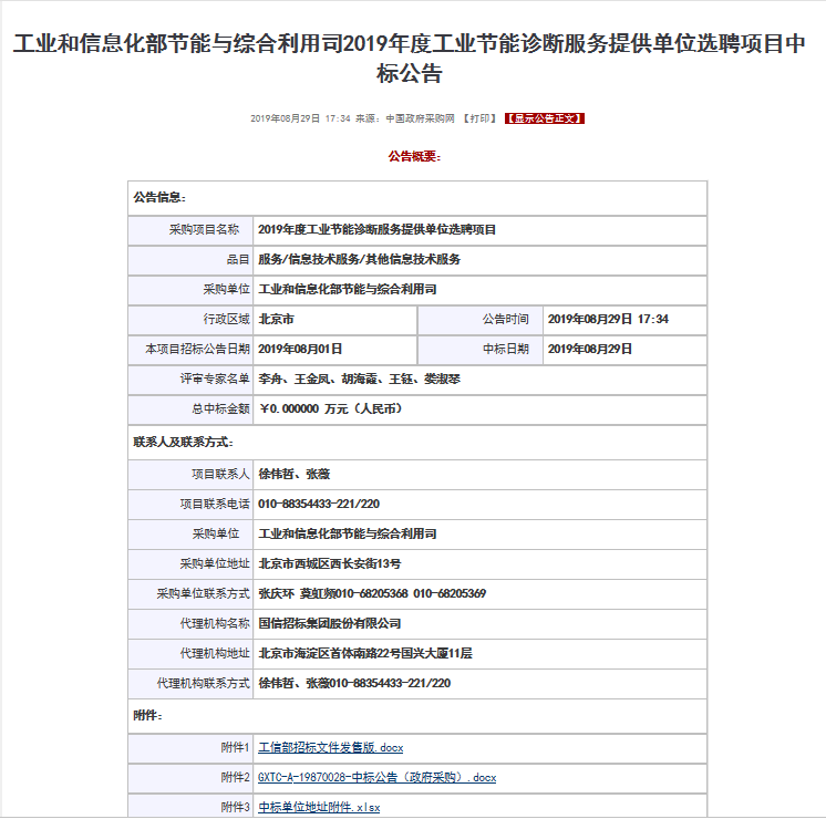 2019年8月30日,公司成功入選工業(yè)和信息化部節(jié)能與綜合利用司“2019年度工業(yè)節(jié)能診斷服務(wù)提供單位選聘項(xiàng)目”。(http://www.ccgp.gov.cn/cggg/zygg/zbgg/201908/t20190829_12790036.htm)