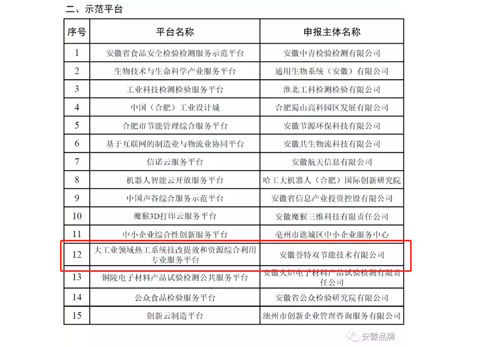 近日,我公司——大工業(yè)領(lǐng)域熱工系統(tǒng)技改提效和資源綜合利用專業(yè)服務(wù)平臺(tái),經(jīng)安徽省經(jīng)信廳,認(rèn)定為安徽省第二批省級服務(wù)型制造示范平臺(tái),全省共計(jì)評定出15個(gè)專業(yè)性服務(wù)示范平臺(tái),含金量高,社會(huì)影響力強(qiáng)。
