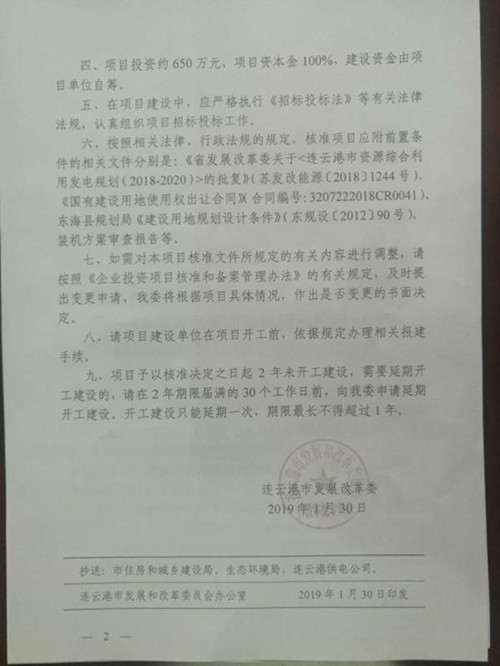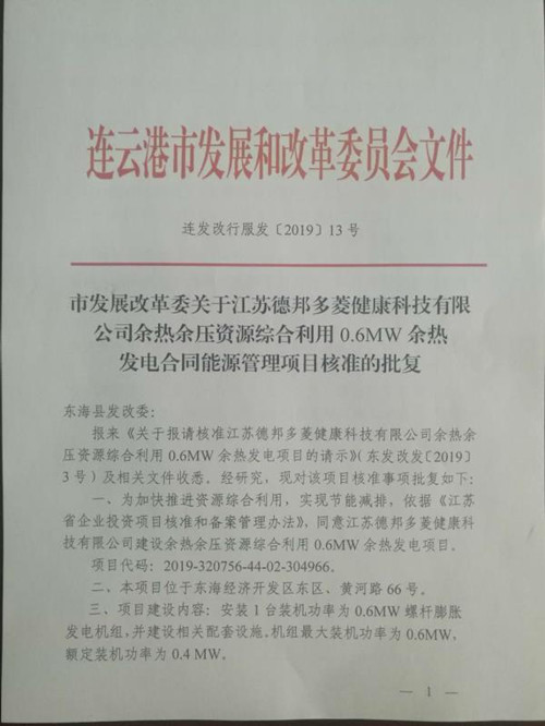 該項(xiàng)目當(dāng)前進(jìn)展順利,經(jīng)大力推動(dòng),已順利獲取《江蘇省發(fā)展改革委關(guān)于<連云港市資源綜合利用發(fā)電規(guī)劃(2018-2020)>的批復(fù)》(蘇發(fā)改能源〔2018〕1244號(hào))、《連云港市發(fā)展改革委關(guān)于江蘇德邦多菱健康科技有限公司余熱余壓資源綜合利用0.6MW余熱發(fā)電合同能源管理項(xiàng)目核準(zhǔn)的批復(fù)》(連發(fā)改行服發(fā)〔2019〕13號(hào))、《東海縣發(fā)改委關(guān)于報(bào)請(qǐng)核準(zhǔn)江蘇德邦多菱健康科技有限公司余熱余壓資源綜合利用0.6MW余熱發(fā)電項(xiàng)目的請(qǐng)示》(東發(fā)改發(fā)〔2019〕3號(hào))、《裝機(jī)方案審查報(bào)告》等文件和項(xiàng)目核準(zhǔn)批文。