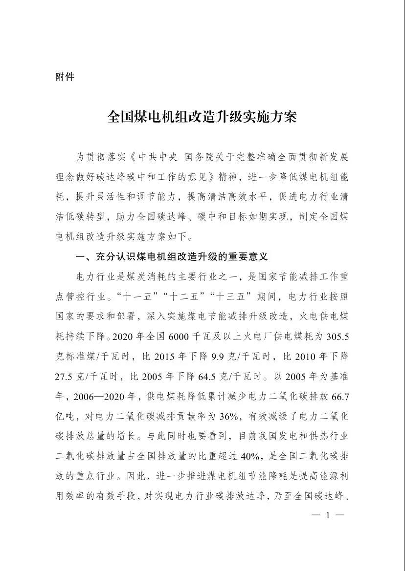 為認(rèn)真貫徹落實《中共中央 國務(wù)院關(guān)于完整準(zhǔn)確全面貫徹新發(fā)展理念做好碳達峰碳中和工作的意見》精神,推動能源行業(yè)結(jié)構(gòu)優(yōu)化升級,進一步提升煤電機組清潔高效靈活性水平,促進電力行業(yè)清潔低碳轉(zhuǎn)型,助力全國碳達峰、碳中和目標(biāo)如期實現(xiàn),國家發(fā)展改革委、國家能源局會同有關(guān)方面制定了《全國煤電機組改造升級實施方案》(以下簡稱《實施方案》),現(xiàn)印發(fā)你們,請遵照執(zhí)行?,F(xiàn)將有關(guān)落實事項通知如下: