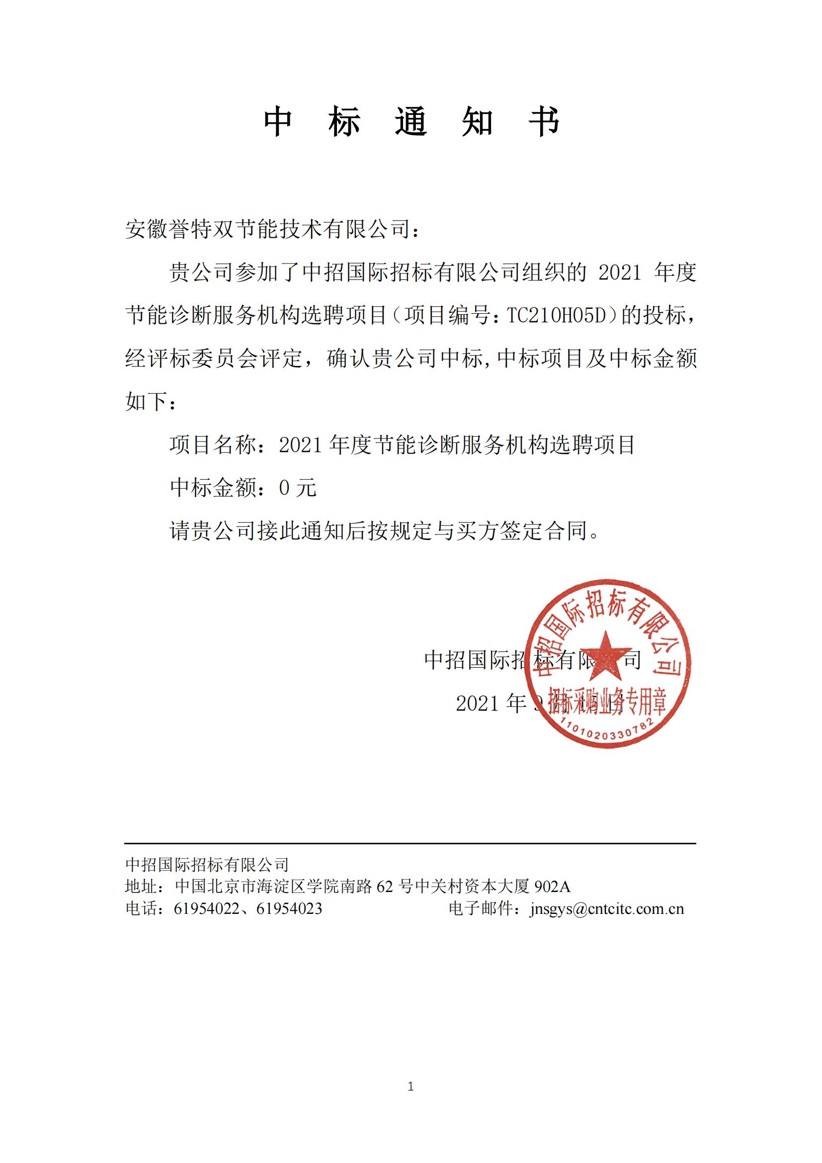 2021年國(guó)家工業(yè)節(jié)能診斷中標(biāo)通知書(shū)