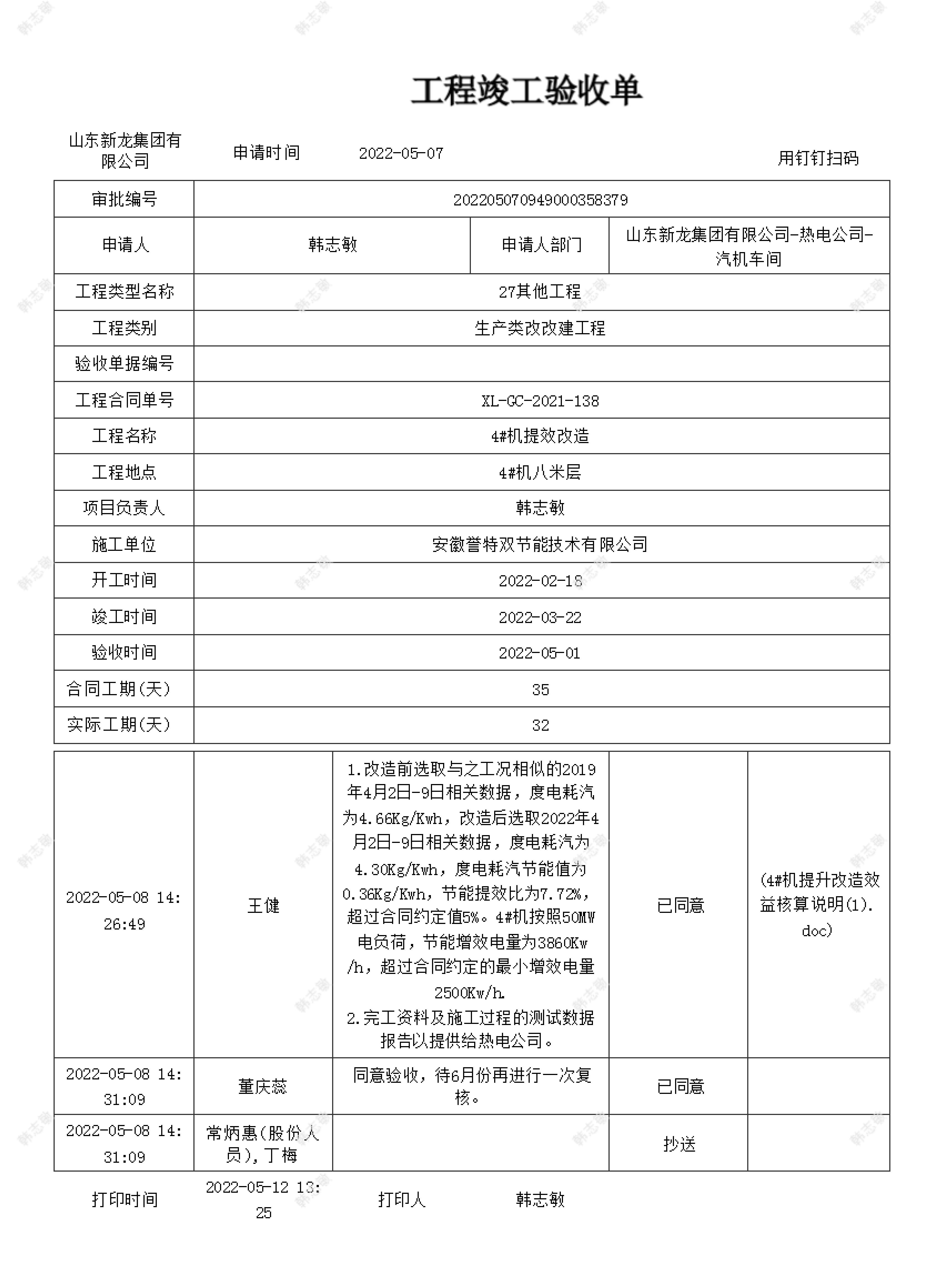 我安徽譽(yù)特雙節(jié)能技術(shù)有限公司,承接的山東新龍集團(tuán)55MW汽輪機(jī)4#機(jī)組通流結(jié)構(gòu)技改提效項(xiàng)目,自2022年3月25日一次性開機(jī)沖轉(zhuǎn)成功并網(wǎng)以來,當(dāng)前已順利運(yùn)行42天,機(jī)組各項(xiàng)參數(shù)指標(biāo)均正常、穩(wěn)定。項(xiàng)目于近日順利通過工程驗(yàn)收,實(shí)測同等工況條件下,節(jié)能提效比例達(dá)7.72%,遠(yuǎn)超合同約定的5%考核指標(biāo),同時(shí)合同約定改造工期為35天,實(shí)際完成為32天,節(jié)約三天時(shí)間。