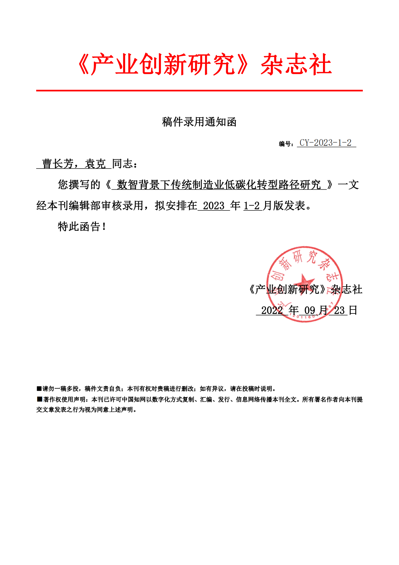 近日,我公司參與撰寫的專業(yè)學術論文《數(shù)智背景下傳統(tǒng)制造業(yè)低碳化轉(zhuǎn)型路徑研究》,經(jīng)國家新聞出版總署的部級期刊《產(chǎn)業(yè)創(chuàng)新研究》雜志社審核通過并予以錄用,擬安排在2023年1-2月版發(fā)表,在此表示熱烈祝賀。
