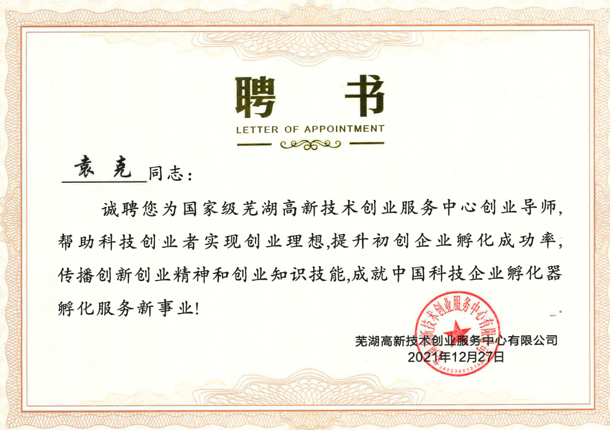 近日,我公司總經(jīng)理袁克同志被聘為國家級(jí)蕪湖高新技術(shù)創(chuàng)業(yè)服務(wù)中心有限公司“創(chuàng)業(yè)導(dǎo)師”。