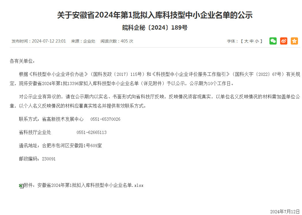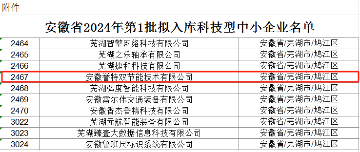 近日,根據(jù)《工業(yè)和信息化部辦公廳關于開展2024年度科技型中小企業(yè)評價工作的通知》(工信廳企業(yè)函﹝2024﹞244號)要求,通過企業(yè)評價、政府科技部門逐層審核,安徽省科學技術廳最終發(fā)布2024年第1批入庫科技型中小企業(yè)名單,我公司榮列榜單,在此表示祝賀。