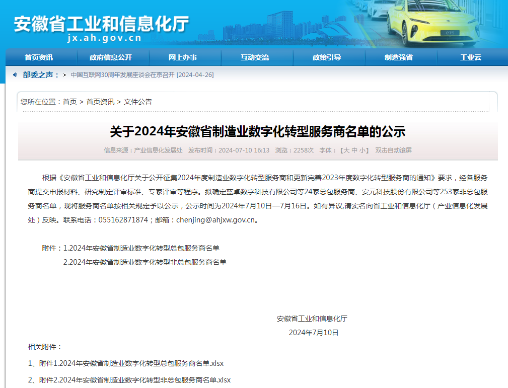 近日,根據(jù)《安徽省工業(yè)和信息化廳關(guān)于公開(kāi)征集2024年度制造業(yè)數(shù)字化轉(zhuǎn)型服務(wù)商和更新完善2023年度數(shù)字化轉(zhuǎn)型服務(wù)商的通知》要求,經(jīng)各服務(wù)商提交申報(bào)材料、研究制定評(píng)審標(biāo)準(zhǔn)、專(zhuān)家評(píng)審等程序,由安徽省工業(yè)和信息化廳發(fā)布2024年安徽省制造業(yè)數(shù)字化轉(zhuǎn)型服務(wù)商名單,我公司名列其中,在此表示熱烈祝賀!