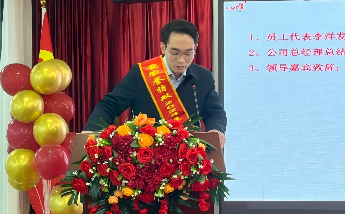 公司特邀嘉賓代表分別作了指導講話,一致對安徽譽特雙所取得的成就表示贊同和認可,也希望譽特雙在今后工作中齊心協(xié)力、努力拼搏、攜手共進,創(chuàng)造新的業(yè)績增長與發(fā)展壯大!同時,2024年度明日之星獲得者李洋作為員工代表進行了發(fā)言。